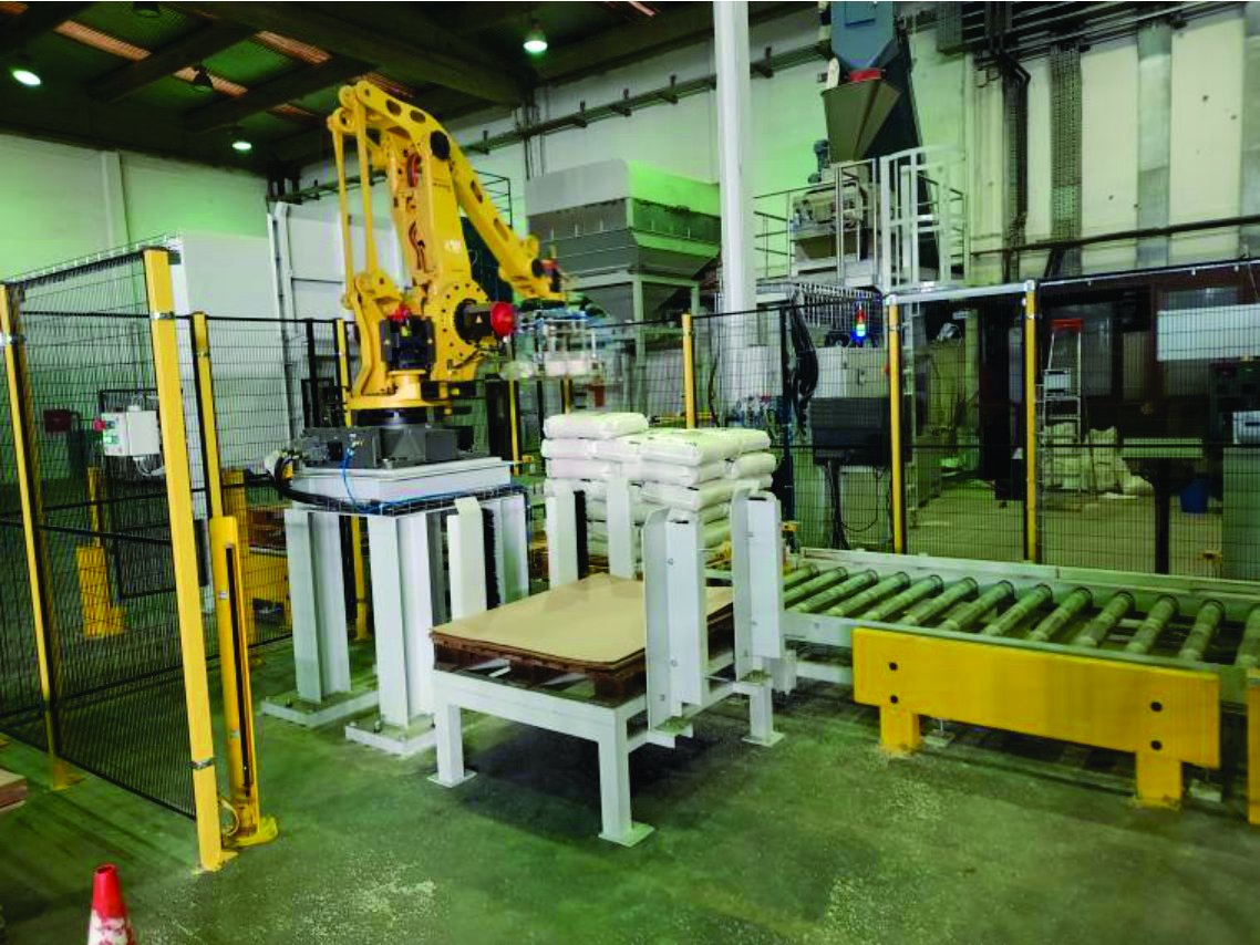 Filled bags are transported to a palletizing station where a Fanuc industrial robot picks up each bag and stacks it onto pallets. The system places a slip sheet before the first layer and organizes the bags in structured layers. Each pallet contains 50 bags (10 layers) with a maximum pallet height of 1800 mm, reaching a capacity of 12 pallets per hour.